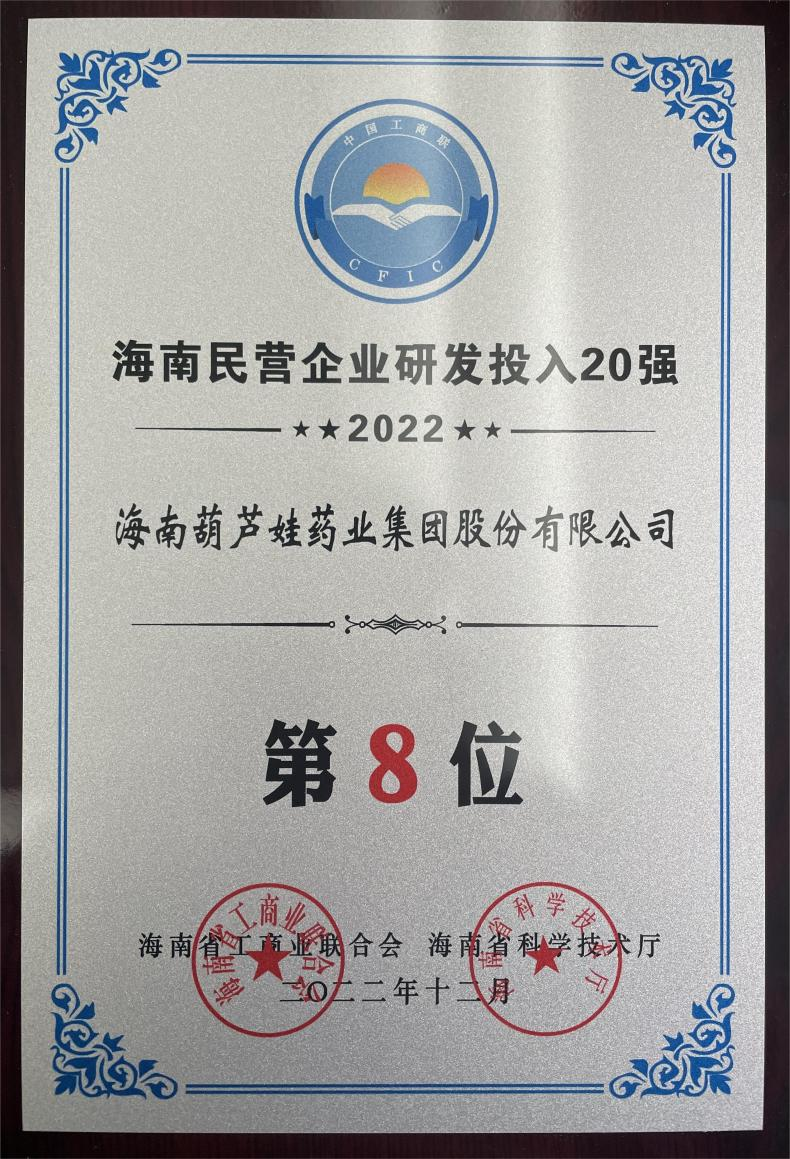 12月23日,2022海南民营企业50强和研发投入20强发布会在海口举行。会上发布了“2022海南民营企业50强”“2022海南民营企业研发投入20强”榜单和分析报告。尊龙药业再次荣登两榜,在海南民营企业50强榜单中位列第25位,较去年上升8位,这也是公司连续三年登榜;在海南民营企业研发投入20强中位列第8位,较去年上升7位。